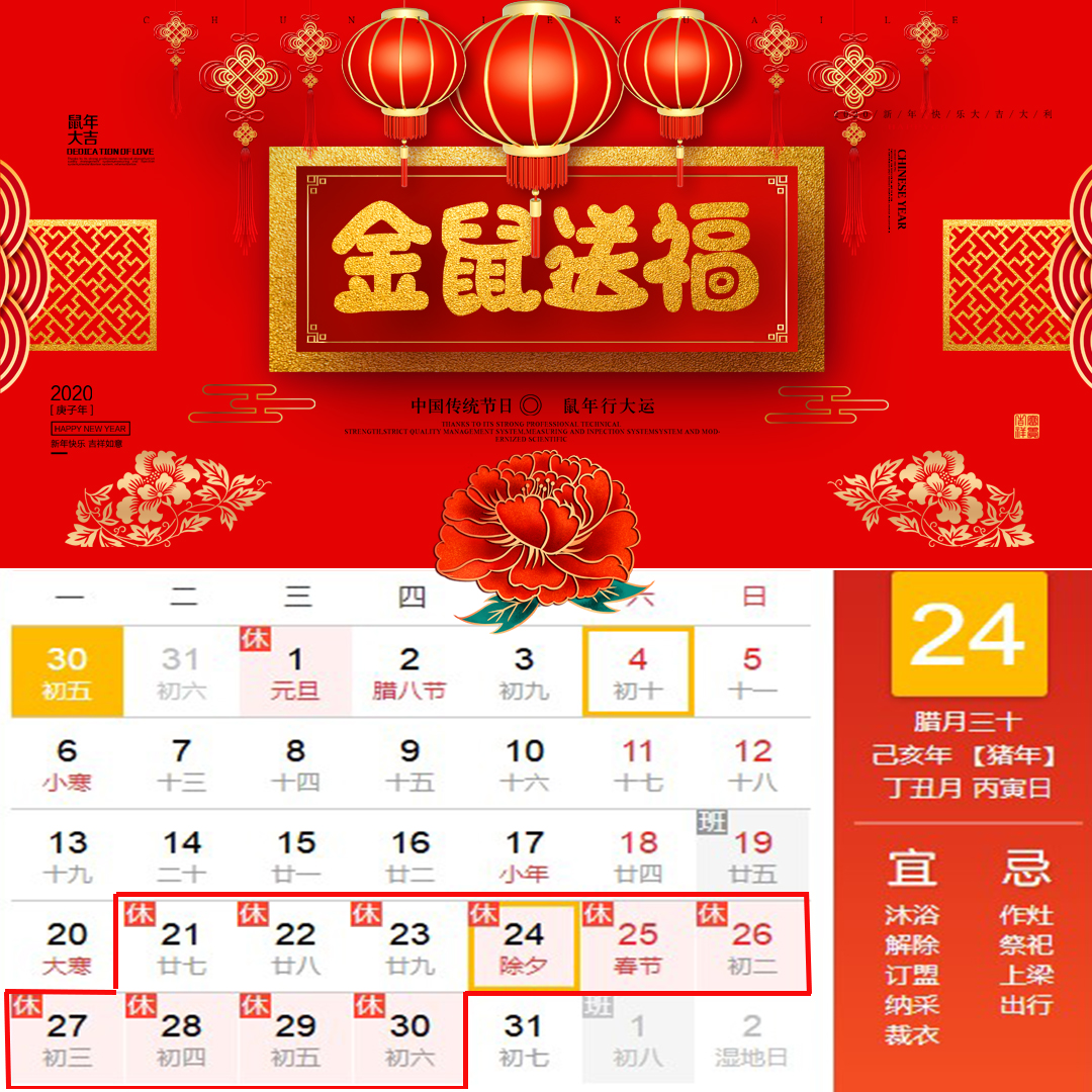 春节放假时间:2020年1月22日——2020年1月30日,共九天;