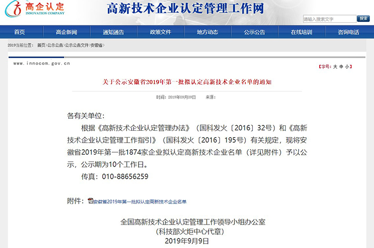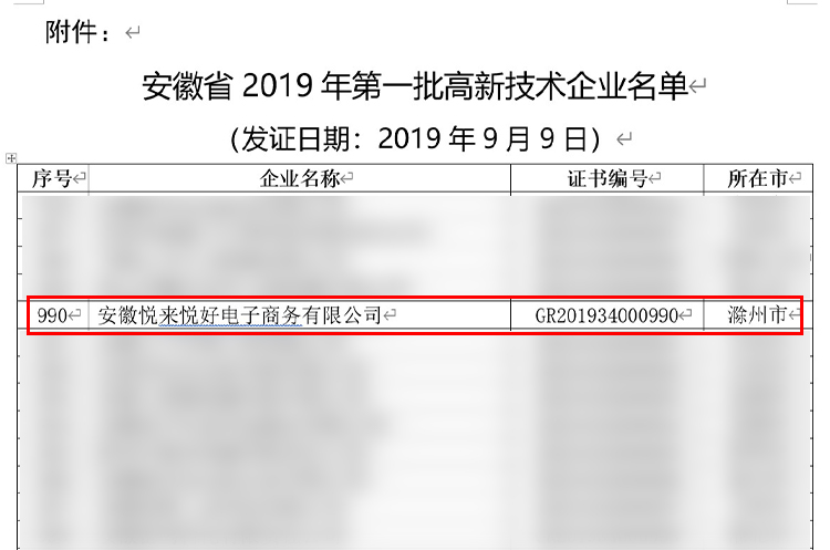 近日,全国高新技术企业认定管理工作领导小组办公室在高新技术企业认定管理工作网中公示了安徽省2019年拟认定的高新技术企业名单,安徽悦来悦好电子商务有限公司顺利通过国家各个部门的层层严格筛选与审查,荣获2019年“国家高新技术企业”称号!