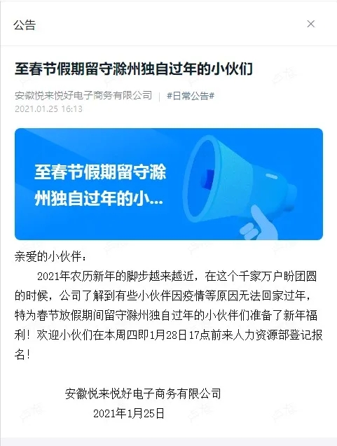 好消息!悦来悦好为留滁过年的外地员工发福利啦!