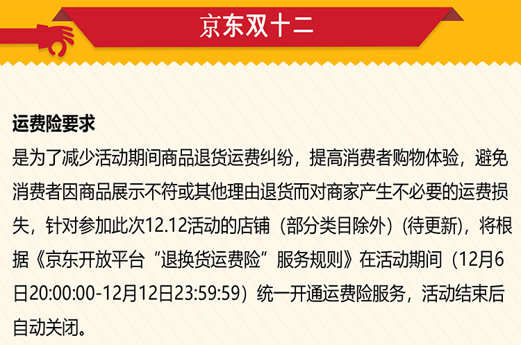 活动期间(12月6日20:00:00-12月12日23:59:59)成交的订单,需要在48小时内完成发货,发货后72小时内要有物流更新记录。注:本时效要求中“发货”是指在物流公司系统内可查看到订单的物流状态(揽件、中转、派送、签收等)。定制、大件类及预售、预订类等另行约定发货时间的商品除外,特殊品类及订单发货时效要求以《京东开放平台发货管理规则》为准。