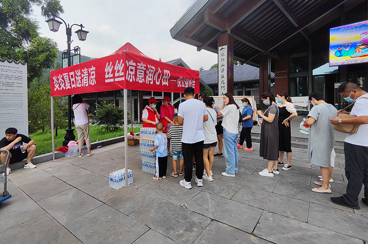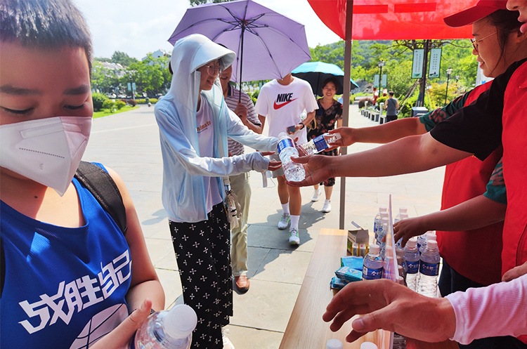 闷热的天,景区里的游客们满头大汗,志愿者们早早就准备好充足的纯净水、湿巾、风油精、创可贴等物资供游客们选择,并为游客们提供一些力所能及的志愿服务。每当有游客经过,我们的志愿者都会送上一瓶水,并叮嘱他们在高温天气中登山注意安全。