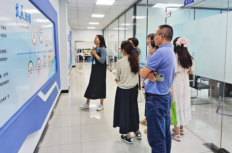悦来悦好人资部主管张大丽热情招待来访领导,在张主管的陪同下,杨云飞带领考察团一行实地参观了我司合作品牌展示区、企业文化走廊和客服大厅等重要场所,并向各位参观人员介绍了我司目前取得的成就以及发展历程。