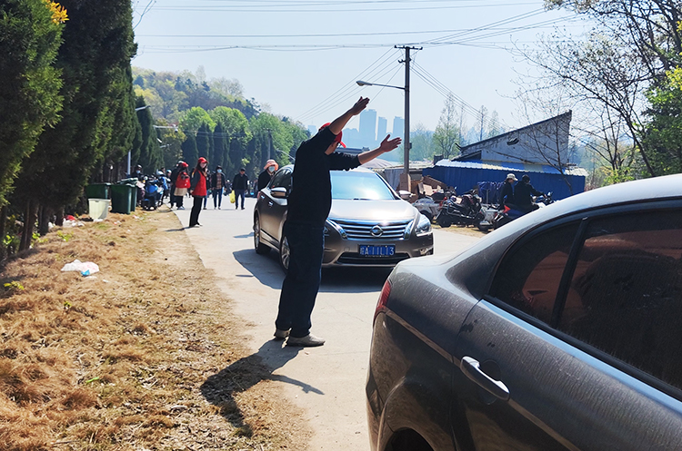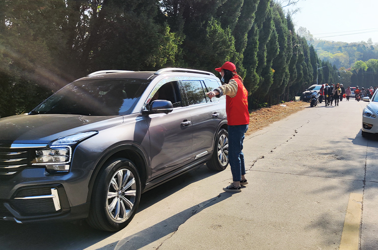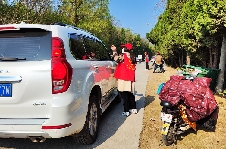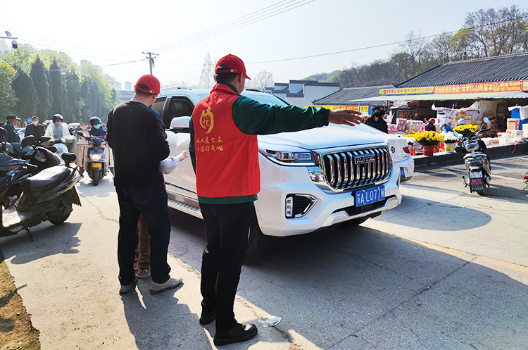 志愿者们身穿红马甲,在通往琅琊山公墓入口的道路两侧有序疏导指挥交通,对电动车、摩托车、三轮车以及机动车乱停乱放、逆向行驶等交通违法行为进行文明劝导,保证上山扫墓的道路畅通无阻,并为来往的车辆指路。