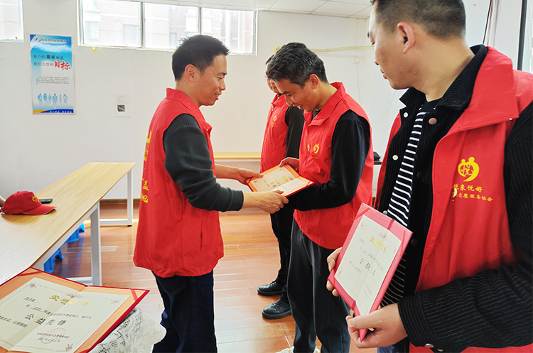 为了感谢成员在过去的一年中对协会发展做出的积极贡献,协会特组织了“优秀会员评选”颁奖仪式,协会会长吴强顺分别为悦子君、悦中天、悦清风、悦星海、悦伏天5人颁发了“公益先锋”荣誉证书并拍照留念,勉励大家向他们学习,号召全体会员要以更加积极的心态参与各项公益活动。
