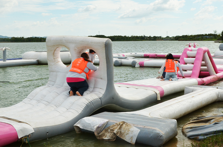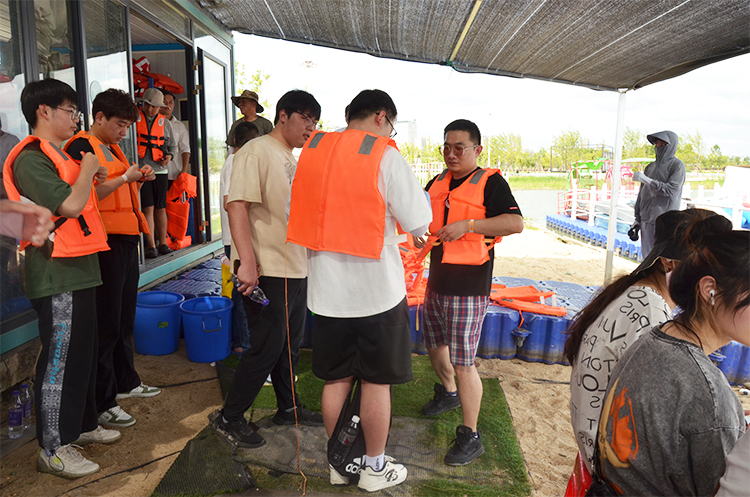 游戏活动之前,在教练的带领下,伙伴们一起做起了热身运动,大家按照要求佩戴好救生装备,进入水上乐园,体验水上游乐项目。