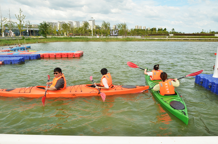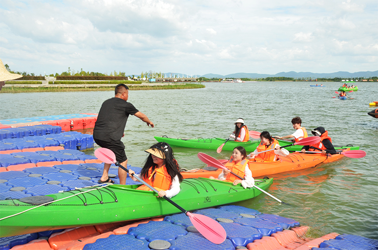 在教练的指导下,小伙伴们拿起桨板,坐到皮划艇里下水练习。起初,因为广阔的湖面和生疏的操作技巧,不少人都很紧张。但随着时间的推移,大家逐渐掌握了划行节奏,开始享受起这份乐趣。