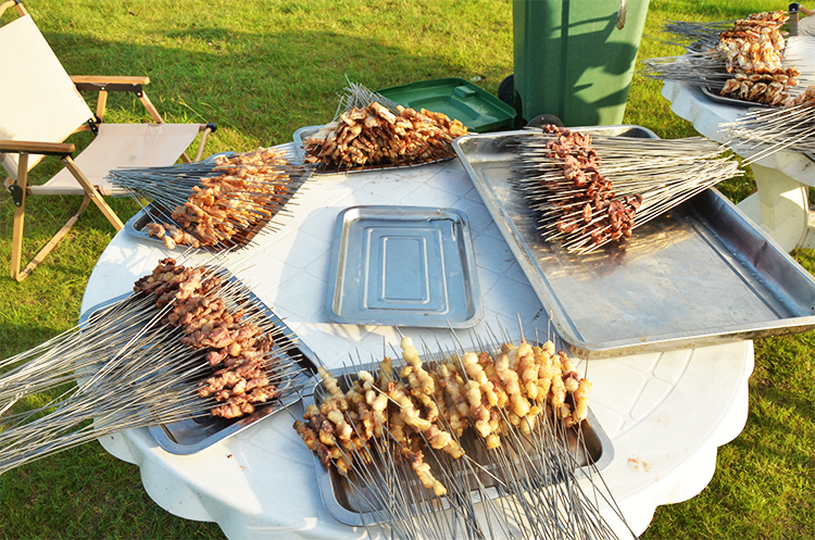新鲜的食材整齐排列,在炭火的熏烤下,牛肉、羊肉、土豆、蘑菇等美食小串散发出诱人的香气。大家围坐在餐桌边,边品尝美食边畅谈心事。