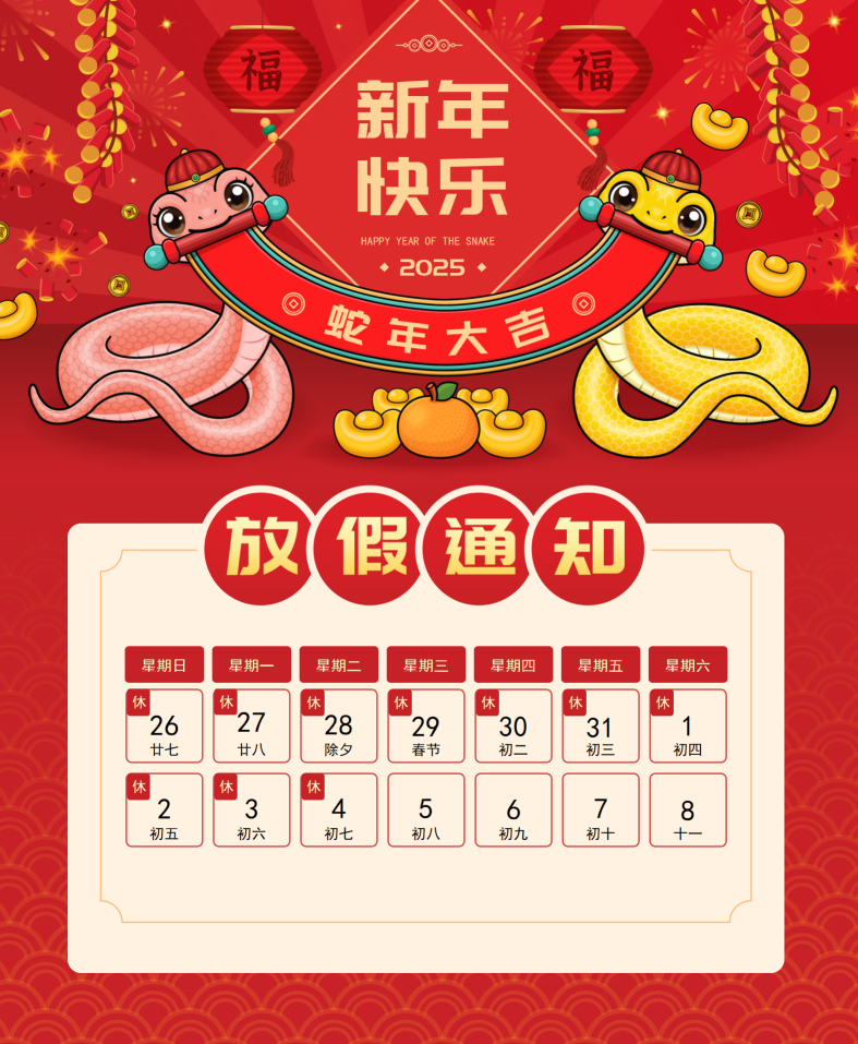 感谢您在过去一年中给予的宝贵支持与关怀。随着2025年春节的临近,为确保您的工作不受影响,经过慎重讨论,现将我司2025年春节假期安排通知如下: