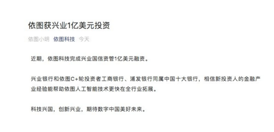 7月16日晚,依图科技宣布完成1亿美元融资,兴业国信资管投资。依图科技在官方微信表示,相信新投资人的金融产业经验能帮助依图人工智能技术更快在全行业拓展。