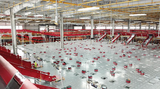 京东武汉亚一仓库内 分拣AGV正在繁忙工作