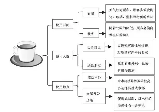 顾客为什么要买这件商品?这是客服在推销自己商品时首先应该思考的问题。针对顾客购买商品的不同用途,客服推销的商品也应该是有区别的。我们以购买杯子为案例进行讲解,顾客购买用途分类由图示可知,根据顾客购买商品的用途不一,客服在进行推荐和销售的时候一定要注意顾客的侧重点,根据顾客的需要有针对性地推荐产品。