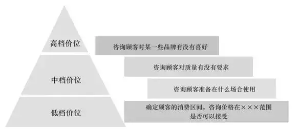 咨询顾客的购买预算是一个比较敏感的话题,这会让顾客觉得客服是在怀疑他的经济能力,不但不能推荐销售商品,还会让顾客心里觉得不舒服,中断购买欲望。但客服如果不清楚顾客的购买预算,很难有针对性地选择适当的价位推荐给顾客。因此,客服在询问顾客购买预算的时候一定要注意循序渐进的原则,如图所示。
