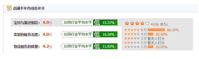计算方法:每项店铺评分取连续6个月内买家给与该项评分的总和/连续6个月内买家给与该项评分的次数。