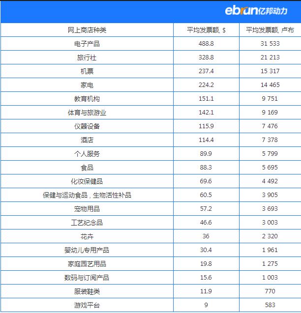 2018年,根据Yandex支付的分析结果,按平均发票额的多少外商最佳类别排名分别是: