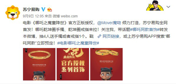 据《电商报》获悉,此次苏宁易购携手Mover魔吻独家首发的新品为法器系列中的“哪吒封印乾坤圈手镯”及“哪吒封印乾坤圈对戒”,是官方独家授权以电影中封印哪吒魔性的乾坤圈法器为创作原型;后续苏宁易购、Mover魔吻还将陆续推出更多《哪吒》周边衍生品,满足消费者需求。