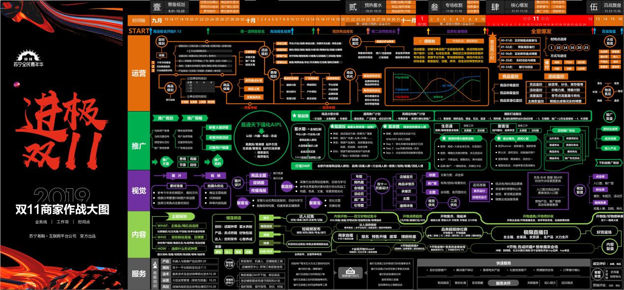 9月27日消息,近日,苏宁易购发布2019双11商家作战图,干货满满,全业态全场景携手商家发力双十一。本次苏宁双十一战线从9月中旬一直到11月中旬。苏宁以“人”“货”“场”为主线打造全场景、全渠道的双十一购物狂欢,分别在运营、推广和视觉等方面给商家提供多方面支持,助力销量冲击。