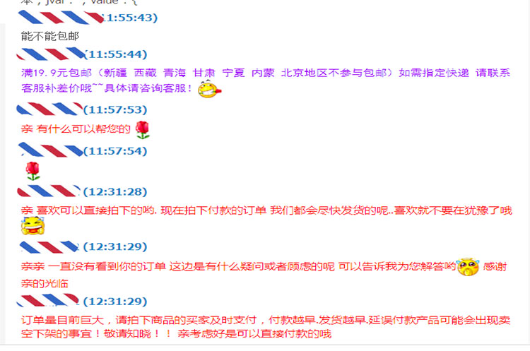 在促成订单的最后环节,在线客服还可以就客户对物流运输产生的疑虑加以明确,告知客户自家店铺与多家物流公司合作,在条件允许的情况下,可以按照客户的喜好来优先选择物流。还可以告知客户所选物流运输时效的大致说明,不要把物流时效承诺说得太死,防止后续因特殊原因造成物流不能在双方规定的时间内到达而产生不必要的麻烦。毕竟在整个交易过程中,物流是交易双方都无法把控的一个环节。