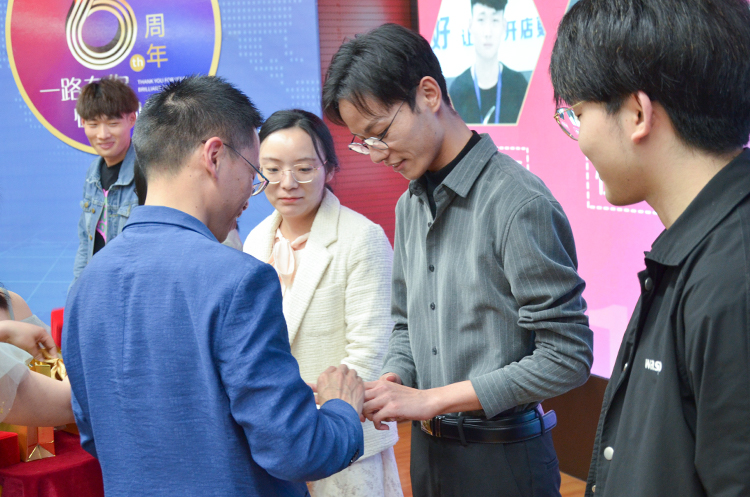 “能干会玩”是一种生命的平衡,可以提高我们的生命质量,可以帮助我们迈向更健康的人生;会玩的人思想和生活上更加丰富,自然更具有分析能力、想象力和创造力,会让生活更有激情和活力,心理健康综合指数同样也会更高。悦来悦好真心希望每一位家人都能做一个能干会玩的人!接下来就到了本次仪式最关键的时刻:为了感谢家人们为公司发展作出的巨大贡献,公司将对入司一周年、三周年的员工送上一枚专属定制的戒指。