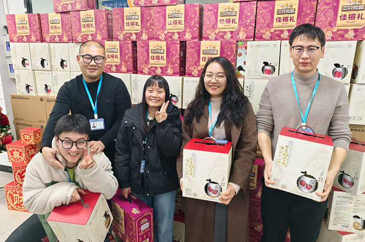 现场温馨有序,欢笑不断。员工们依次领取年货礼盒,有的举着礼盒合影留念,有的彼此分享喜悦,“今年的年货搭配太贴心了!坚果营养美味,米酒醇香暖人,实实在在感受到了公司大家庭的温暖!”大家纷纷说道。